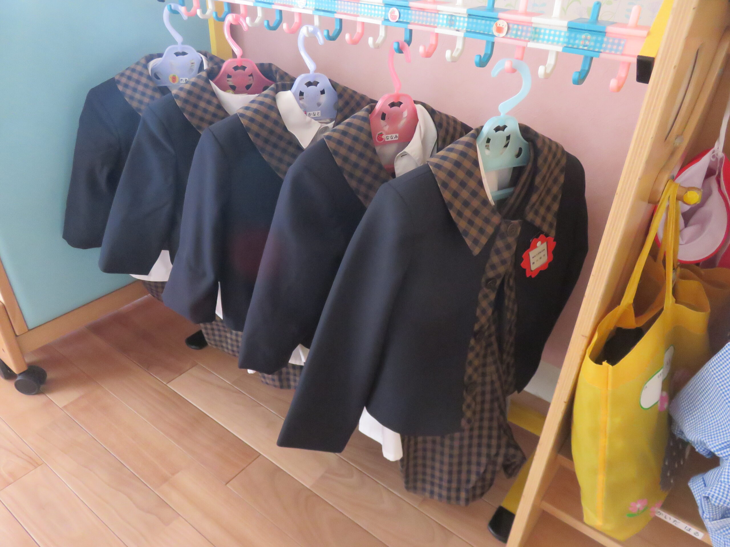 登園時着てきた真新しい制服はハンガーへ。日中は体操服に着替えて活動します。朝の支度は大忙しだけど、ちょっとブカブカな制服姿のばら組さんサイコーに可愛いいんです☆